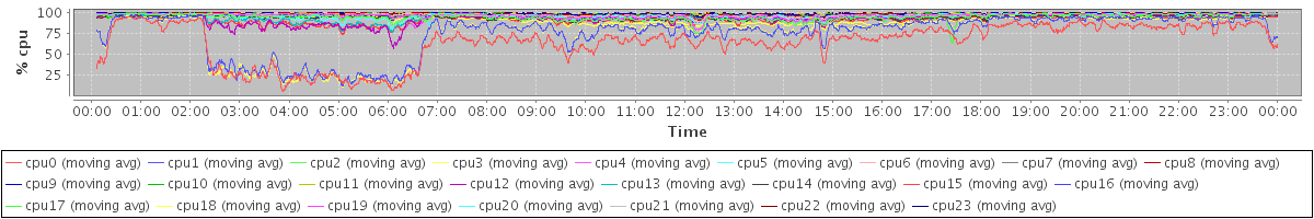 avg(cpu0) = 0.18 avg(cpu1) = 0.17 avg(cpu2) = 0.10 avg(cpu3) = 0.19 avg(cpu4) = 0.06 avg(cpu5) = 0.04 avg(cpu6) = 0.03 avg(cpu7) = 0.02 avg(cpu8) = 0.02 avg(cpu9) = 0.01 avg(cpu10) = 0.01 avg(cpu11) = 0.00 avg(cpu12) = 0.03 avg(cpu13) = 0.01 avg(cpu14) = 0.05 avg(cpu15) = 0.06 avg(cpu16) = 0.04 avg(cpu17) = 0.04 avg(cpu18) = 0.07 avg(cpu19) = 0.04 avg(cpu20) = 0.04 avg(cpu21) = 0.00 avg(cpu22) = 0.00 avg(cpu23) = 0.00