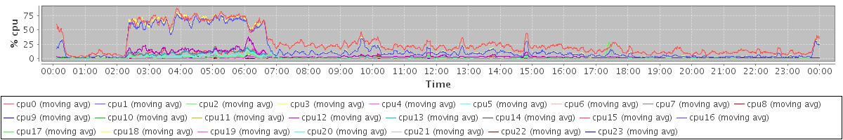 avg(cpu0) = 26.80 avg(cpu1) = 17.85 avg(cpu2) = 0.86 avg(cpu3) = 18.86 avg(cpu4) = 0.38 avg(cpu5) = 1.06 avg(cpu6) = 0.18 avg(cpu7) = 0.29 avg(cpu8) = 0.11 avg(cpu9) = 0.10 avg(cpu10) = 0.09 avg(cpu11) = 0.04 avg(cpu12) = 4.23 avg(cpu13) = 2.29 avg(cpu14) = 0.52 avg(cpu15) = 2.58 avg(cpu16) = 0.46 avg(cpu17) = 0.69 avg(cpu18) = 0.49 avg(cpu19) = 0.79 avg(cpu20) = 0.49 avg(cpu21) = 0.05 avg(cpu22) = 0.01 avg(cpu23) = 0.02
