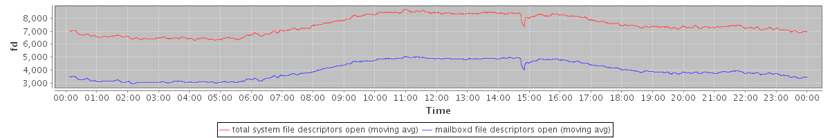 avg(total system file descriptors open) = 7433.91 avg(mailboxd file descriptors open) = 3973.07