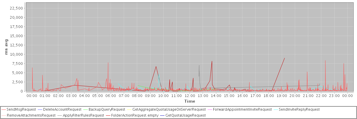 avg(SendMsgRequest) = 427.98 avg(DeleteAccountRequest) = 22918.00 avg(BackupQueryRequest) = 568.67 avg(GetAggregateQuotaUsageOnServerRequest) = 1314.00 avg(ForwardAppointmentInviteRequest) = 453.00 avg(SendInviteReplyRequest) = 462.95 avg(RemoveAttachmentsRequest) = 365.94 avg(ApplyFilterRulesRequest) = 2474.00 avg(FolderActionRequest.empty) = 848.48 avg(GetQuotaUsageRequest) = 1791.00