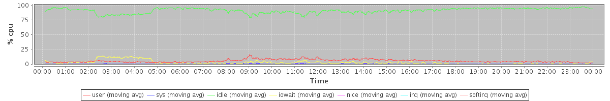 avg(user) = 5.39 avg(sys) = 0.50 avg(idle) = 91.13 avg(iowait) = 2.76 avg(nice) = 0.13 avg(irq) = 0.00 avg(softirq) = 0.08