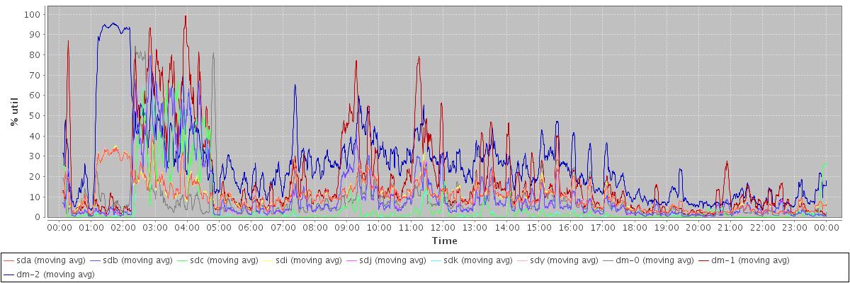 avg(sda) = 10.41 avg(sdb) = 10.26 avg(sdc) = 5.40 avg(sdi) = 10.41 avg(sdj) = 10.23 avg(sdk) = 5.33 avg(sdy) = 10.49 avg(dm-0) = 8.34 avg(dm-1) = 18.54 avg(dm-2) = 26.31