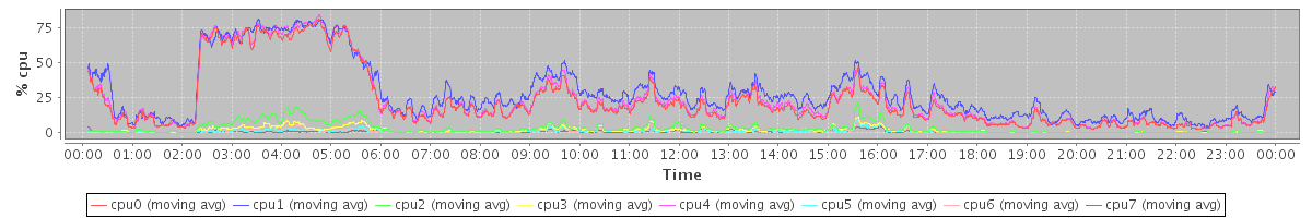 avg(cpu0) = 22.58 avg(cpu1) = 28.49 avg(cpu2) = 3.09 avg(cpu3) = 1.79 avg(cpu4) = 24.02 avg(cpu5) = 0.94 avg(cpu6) = 1.01 avg(cpu7) = 0.52