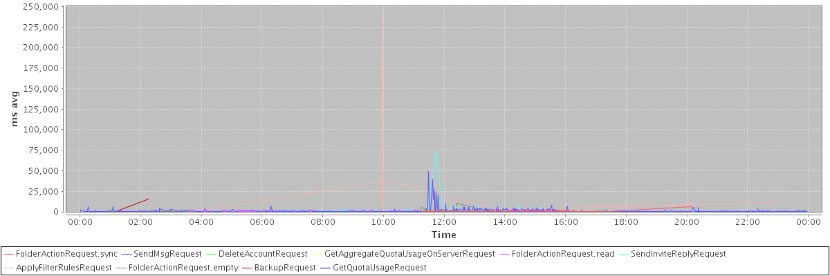 avg(FolderActionRequest.sync) = 2531.33 avg(SendMsgRequest) = 1149.97 avg(DeleteAccountRequest) = 43609.00 avg(GetAggregateQuotaUsageOnServerRequest) = 4277.00 avg(FolderActionRequest.read) = 692.67 avg(SendInviteReplyRequest) = 2036.21 avg(ApplyFilterRulesRequest) = 32025.91 avg(FolderActionRequest.empty) = 665.88 avg(BackupRequest) = 8334.00 avg(GetQuotaUsageRequest) = 5304.00