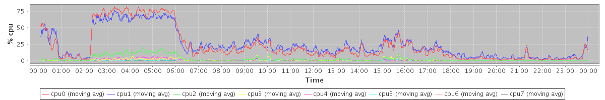 avg(cpu0) = 1.07 avg(cpu1) = 0.96 avg(cpu2) = 0.70 avg(cpu3) = 0.57 avg(cpu4) = 0.45 avg(cpu5) = 0.39 avg(cpu6) = 0.30 avg(cpu7) = 0.25