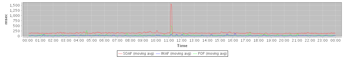 avg(SendMsgRequest) = 616.76 avg(DeleteAccountRequest) = 22560.00 avg(GetAggregateQuotaUsageOnServerRequest) = 1945.00 avg(CreateAppointmentExceptionRequest) = 685.36 avg(SendInviteReplyRequest) = 528.30 avg(RemoveAttachmentsRequest) = 554.62 avg(FolderActionRequest.empty) = 2150.59 avg(SendShareNotificationRequest) = 628.62 avg(BackupRequest) = 13483.00 avg(GetQuotaUsageRequest) = 2494.00