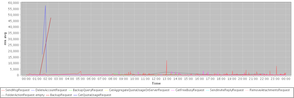 avg(SendMsgRequest) = 426.28 avg(DeleteAccountRequest) = 25801.00 avg(BackupQueryRequest) = 511.60 avg(GetAggregateQuotaUsageOnServerRequest) = 2201.00 avg(GetFreeBusyRequest) = 169.69 avg(SendInviteReplyRequest) = 400.60 avg(RemoveAttachmentsRequest) = 1017.50 avg(FolderActionRequest.empty) = 488.53 avg(BackupRequest) = 24086.50 avg(GetQuotaUsageRequest) = 2875.00