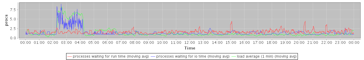 avg(processes waiting for run time) = 0.93 avg(processes waiting for io time) = 0.58 avg(load average (1 min)) = 1.48