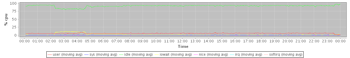 avg(user) = 6.00 avg(sys) = 0.29 avg(idle) = 91.49 avg(iowait) = 2.09 avg(nice) = 0.10 avg(irq) = 0.00 avg(softirq) = 0.01