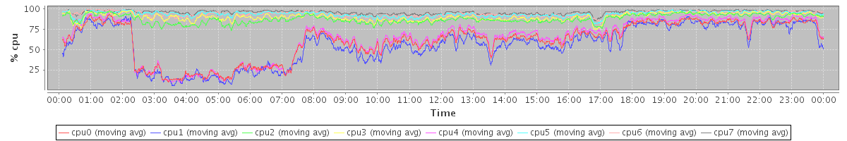 avg(cpu0) = 24.57 avg(cpu1) = 31.58 avg(cpu2) = 2.79 avg(cpu3) = 1.63 avg(cpu4) = 26.56 avg(cpu5) = 0.72 avg(cpu6) = 0.87 avg(cpu7) = 0.38