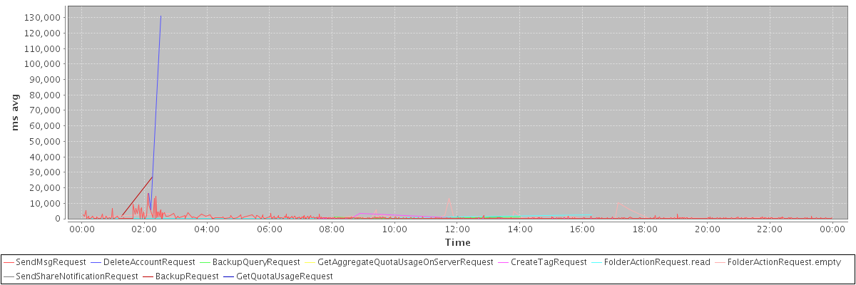 avg(SendMsgRequest) = 573.63 avg(DeleteAccountRequest) = 51135.00 avg(BackupQueryRequest) = 484.60 avg(GetAggregateQuotaUsageOnServerRequest) = 4163.00 avg(CreateTagRequest) = 579.57 avg(FolderActionRequest.read) = 786.00 avg(FolderActionRequest.empty) = 1212.77 avg(SendShareNotificationRequest) = 525.60 avg(BackupRequest) = 14217.50 avg(GetQuotaUsageRequest) = 5678.00