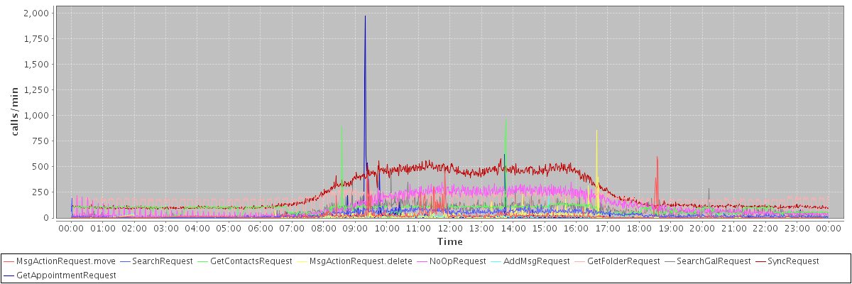 max(MsgActionRequest.move) = 602.00 max(SearchRequest) = 188.00 max(GetContactsRequest) = 963.00 max(MsgActionRequest.delete) = 859.00 max(NoOpRequest) = 352.00 max(AddMsgRequest) = 226.00 max(GetFolderRequest) = 319.00 max(SearchGalRequest) = 457.00 max(SyncRequest) = 578.00 max(GetAppointmentRequest) = 1973.00