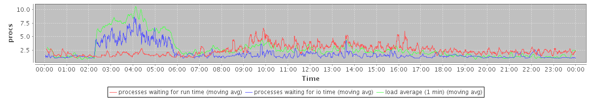 avg(processes waiting for run time) = 2.20 avg(processes waiting for io time) = 1.24 avg(load average (1 min)) = 2.83