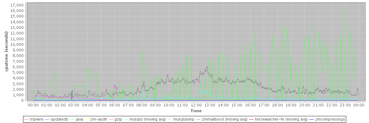 avg(tripwire) = 1966.00 avg(updatedb) = 26.49 avg(java) = 1668.71 avg(zm-audit) = 204.00 avg(gzip) = 2162.21 avg(mysqld) = 367.97 avg(mysqldump) = 192.99 avg(zmmailboxd) = 2115.52 avg(horsewatcher-fe) = 20.53 avg(zmcompresslogs) = 1188.60