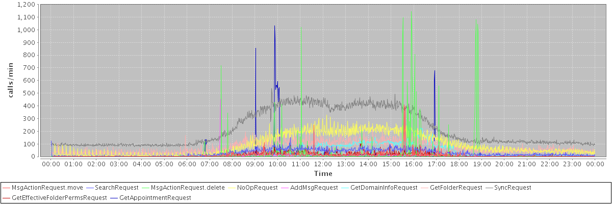 max(MsgActionRequest.move) = 408.00 max(SearchRequest) = 150.00 max(MsgActionRequest.delete) = 1145.00 max(NoOpRequest) = 326.00 max(AddMsgRequest) = 453.00 max(GetDomainInfoRequest) = 235.00 max(GetFolderRequest) = 235.00 max(SyncRequest) = 538.00 max(GetEffectiveFolderPermsRequest) = 147.00 max(GetAppointmentRequest) = 1030.00