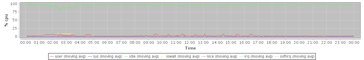 avg(user) = 2.11 avg(sys) = 0.35 avg(idle) = 96.61 avg(iowait) = 0.80 avg(nice) = 0.10 avg(irq) = 0.00 avg(softirq) = 0.01