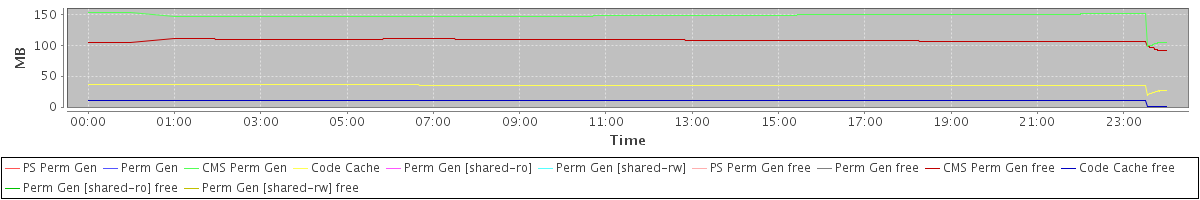 avg(PS Perm Gen) = 0.00 avg(Perm Gen) = 0.00 avg(CMS Perm Gen) = 147.24 avg(Code Cache) = 35.29 avg(Perm Gen [shared-ro]) = 0.00 avg(Perm Gen [shared-rw]) = 0.00 avg(PS Perm Gen free) = 0.00 avg(Perm Gen free) = 0.00 avg(CMS Perm Gen free) = 107.64 avg(Code Cache free) = 10.99 avg(Perm Gen [shared-ro] free) = 0.00 avg(Perm Gen [shared-rw] free) = 0.00