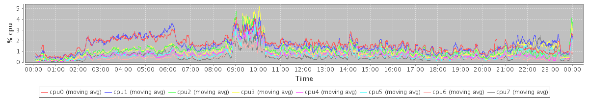 avg(cpu0) = 0.28 avg(cpu1) = 0.25 avg(cpu2) = 0.19 avg(cpu3) = 0.18 avg(cpu4) = 0.12 avg(cpu5) = 0.10 avg(cpu6) = 0.06 avg(cpu7) = 0.12