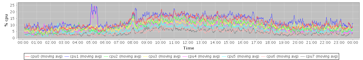 avg(cpu0) = 11.30 avg(cpu1) = 13.08 avg(cpu2) = 8.84 avg(cpu3) = 8.98 avg(cpu4) = 8.25 avg(cpu5) = 6.45 avg(cpu6) = 4.50 avg(cpu7) = 4.42