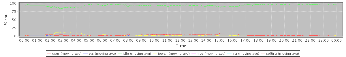 avg(user) = 3.18 avg(sys) = 0.52 avg(idle) = 93.93 avg(iowait) = 2.18 avg(nice) = 0.11 avg(irq) = 0.00 avg(softirq) = 0.07