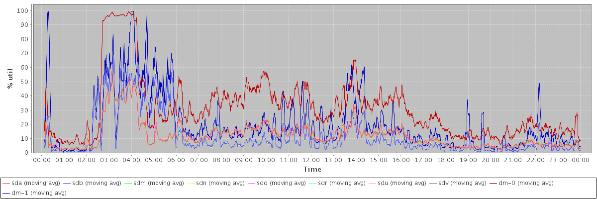 avg(sda) = 12.23 avg(sdb) = 11.57 avg(sdm) = 12.21 avg(sdn) = 11.62 avg(sdq) = 12.27 avg(sdr) = 11.63 avg(sdu) = 12.21 avg(sdv) = 11.62 avg(dm-0) = 31.20 avg(dm-1) = 20.92