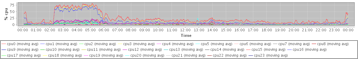 avg(cpu0) = 1.13 avg(cpu1) = 0.99 avg(cpu2) = 0.74 avg(cpu3) = 0.93 avg(cpu4) = 0.60 avg(cpu5) = 0.49 avg(cpu6) = 0.40 avg(cpu7) = 0.35 avg(cpu8) = 0.29 avg(cpu9) = 0.19 avg(cpu10) = 0.21 avg(cpu11) = 0.18 avg(cpu12) = 0.54 avg(cpu13) = 0.38 avg(cpu14) = 0.71 avg(cpu15) = 0.80 avg(cpu16) = 0.53 avg(cpu17) = 0.54 avg(cpu18) = 0.45 avg(cpu19) = 0.44 avg(cpu20) = 0.37 avg(cpu21) = 0.19 avg(cpu22) = 0.15 avg(cpu23) = 0.17