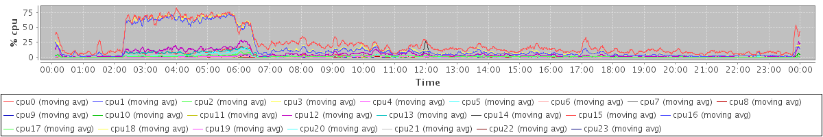 avg(cpu0) = 23.17 avg(cpu1) = 15.88 avg(cpu2) = 1.07 avg(cpu3) = 16.84 avg(cpu4) = 0.56 avg(cpu5) = 1.31 avg(cpu6) = 0.31 avg(cpu7) = 0.50 avg(cpu8) = 0.18 avg(cpu9) = 0.18 avg(cpu10) = 0.20 avg(cpu11) = 0.09 avg(cpu12) = 4.70 avg(cpu13) = 2.13 avg(cpu14) = 0.62 avg(cpu15) = 2.35 avg(cpu16) = 0.40 avg(cpu17) = 0.36 avg(cpu18) = 0.37 avg(cpu19) = 0.36 avg(cpu20) = 0.32 avg(cpu21) = 0.04 avg(cpu22) = 0.03 avg(cpu23) = 0.02