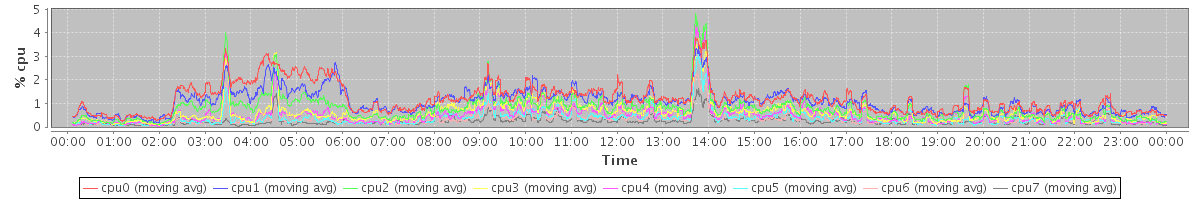 avg(cpu0) = 1.19 avg(cpu1) = 1.07 avg(cpu2) = 0.79 avg(cpu3) = 0.61 avg(cpu4) = 0.52 avg(cpu5) = 0.39 avg(cpu6) = 0.34 avg(cpu7) = 0.26