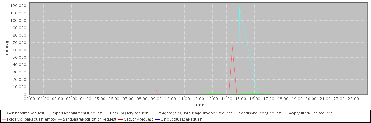 avg(GetShareInfoRequest) = 1233.57 avg(ImportAppointmentsRequest) = 395.00 avg(BackupQueryRequest) = 444.33 avg(GetAggregateQuotaUsageOnServerRequest) = 565.00 avg(SendInviteReplyRequest) = 383.48 avg(ApplyFilterRulesRequest) = 24525.20 avg(FolderActionRequest.empty) = 1196.14 avg(SendShareNotificationRequest) = 321.20 avg(GetConvRequest) = 413.00 avg(GetQuotaUsageRequest) = 622.00