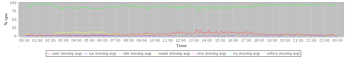 avg(user) = 5.97 avg(sys) = 0.74 avg(idle) = 89.44 avg(iowait) = 3.59 avg(nice) = 0.13 avg(irq) = 0.00 avg(softirq) = 0.11