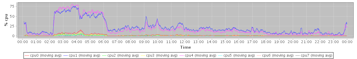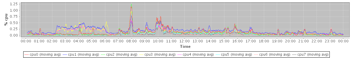 avg(cpu0) = 0.95 avg(cpu1) = 1.22 avg(cpu2) = 0.76 avg(cpu3) = 0.81 avg(cpu4) = 1.01 avg(cpu5) = 0.58 avg(cpu6) = 0.43 avg(cpu7) = 0.40