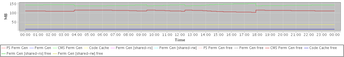 avg(PS Perm Gen) = 0.00 avg(Perm Gen) = 0.00 avg(CMS Perm Gen) = 143.63 avg(Code Cache) = 35.51 avg(Perm Gen [shared-ro]) = 0.00 avg(Perm Gen [shared-rw]) = 0.00 avg(PS Perm Gen free) = 0.00 avg(Perm Gen free) = 0.00 avg(CMS Perm Gen free) = 112.37 avg(Code Cache free) = 11.18 avg(Perm Gen [shared-ro] free) = 0.00 avg(Perm Gen [shared-rw] free) = 0.00