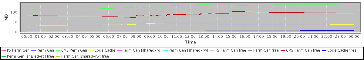 avg(PS Perm Gen) = 0.00 avg(Perm Gen) = 0.00 avg(CMS Perm Gen) = 128.84 avg(Code Cache) = 38.44 avg(Perm Gen [shared-ro]) = 0.00 avg(Perm Gen [shared-rw]) = 0.00 avg(PS Perm Gen free) = 0.00 avg(Perm Gen free) = 0.00 avg(CMS Perm Gen free) = 88.88 avg(Code Cache free) = 3.97 avg(Perm Gen [shared-ro] free) = 0.00 avg(Perm Gen [shared-rw] free) = 0.00