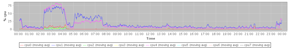 avg(cpu0) = 0.88 avg(cpu1) = 16.09 avg(cpu2) = 0.36 avg(cpu3) = 0.32 avg(cpu4) = 13.20 avg(cpu5) = 0.11 avg(cpu6) = 0.10 avg(cpu7) = 0.04
