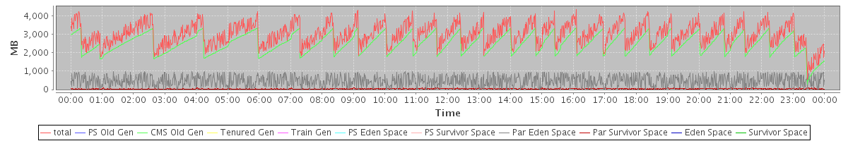 avg(total) = 3003.17 avg(PS Old Gen) = 0.00 avg(CMS Old Gen) = 2485.68 avg(Tenured Gen) = 0.00 avg(Train Gen) = 0.00 avg(PS Eden Space) = 0.00 avg(PS Survivor Space) = 0.00 avg(Par Eden Space) = 478.07 avg(Par Survivor Space) = 39.42 avg(Eden Space) = 0.00 avg(Survivor Space) = 0.00