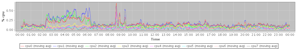 avg(cpu0) = 1.02 avg(cpu1) = 0.96 avg(cpu2) = 0.66 avg(cpu3) = 0.52 avg(cpu4) = 0.40 avg(cpu5) = 0.33 avg(cpu6) = 0.26 avg(cpu7) = 0.36