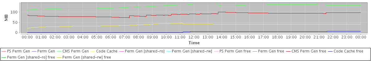 avg(PS Perm Gen) = 0.00 avg(Perm Gen) = 0.00 avg(CMS Perm Gen) = 129.74 avg(Code Cache) = 37.99 avg(Perm Gen [shared-ro]) = 0.00 avg(Perm Gen [shared-rw]) = 0.00 avg(PS Perm Gen free) = 0.00 avg(Perm Gen free) = 0.00 avg(CMS Perm Gen free) = 88.27 avg(Code Cache free) = 3.15 avg(Perm Gen [shared-ro] free) = 0.00 avg(Perm Gen [shared-rw] free) = 0.00