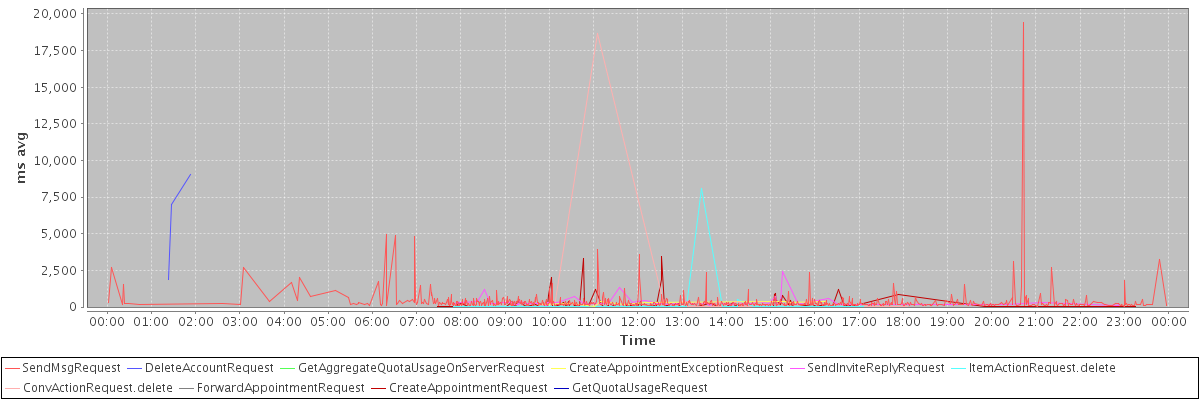 avg(SendMsgRequest) = 339.39 avg(DeleteAccountRequest) = 5962.00 avg(GetAggregateQuotaUsageOnServerRequest) = 567.00 avg(CreateAppointmentExceptionRequest) = 269.44 avg(SendInviteReplyRequest) = 332.81 avg(ItemActionRequest.delete) = 440.70 avg(ConvActionRequest.delete) = 1711.55 avg(ForwardAppointmentRequest) = 294.00 avg(CreateAppointmentRequest) = 211.62 avg(GetQuotaUsageRequest) = 649.00