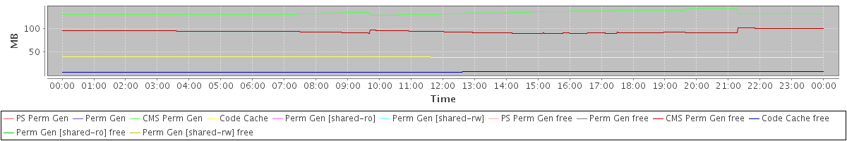 avg(PS Perm Gen) = 0.00 avg(Perm Gen) = 0.00 avg(CMS Perm Gen) = 133.26 avg(Code Cache) = 39.01 avg(Perm Gen [shared-ro]) = 0.00 avg(Perm Gen [shared-rw]) = 0.00 avg(PS Perm Gen free) = 0.00 avg(Perm Gen free) = 0.00 avg(CMS Perm Gen free) = 93.64 avg(Code Cache free) = 7.55 avg(Perm Gen [shared-ro] free) = 0.00 avg(Perm Gen [shared-rw] free) = 0.00