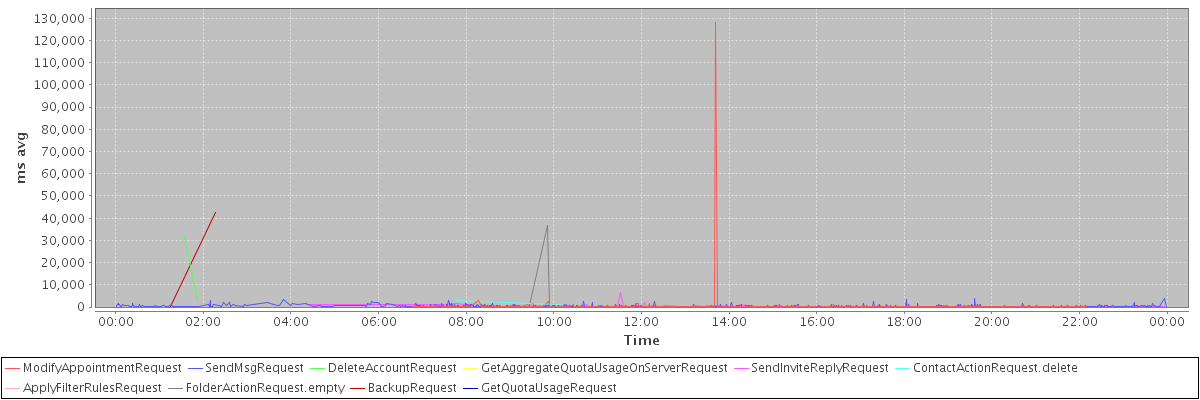 avg(ModifyAppointmentRequest) = 660.14 avg(SendMsgRequest) = 395.08 avg(DeleteAccountRequest) = 20426.67 avg(GetAggregateQuotaUsageOnServerRequest) = 1634.00 avg(SendInviteReplyRequest) = 483.85 avg(ContactActionRequest.delete) = 498.67 avg(ApplyFilterRulesRequest) = 3527.00 avg(FolderActionRequest.empty) = 2317.83 avg(BackupRequest) = 21288.50 avg(GetQuotaUsageRequest) = 2086.00