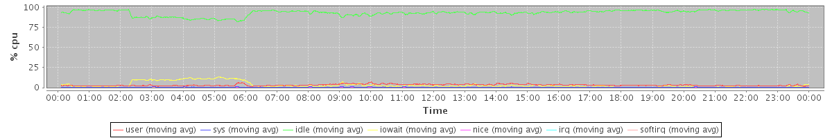 avg(user) = 3.16 avg(sys) = 0.55 avg(idle) = 92.99 avg(iowait) = 3.11 avg(nice) = 0.11 avg(irq) = 0.00 avg(softirq) = 0.10