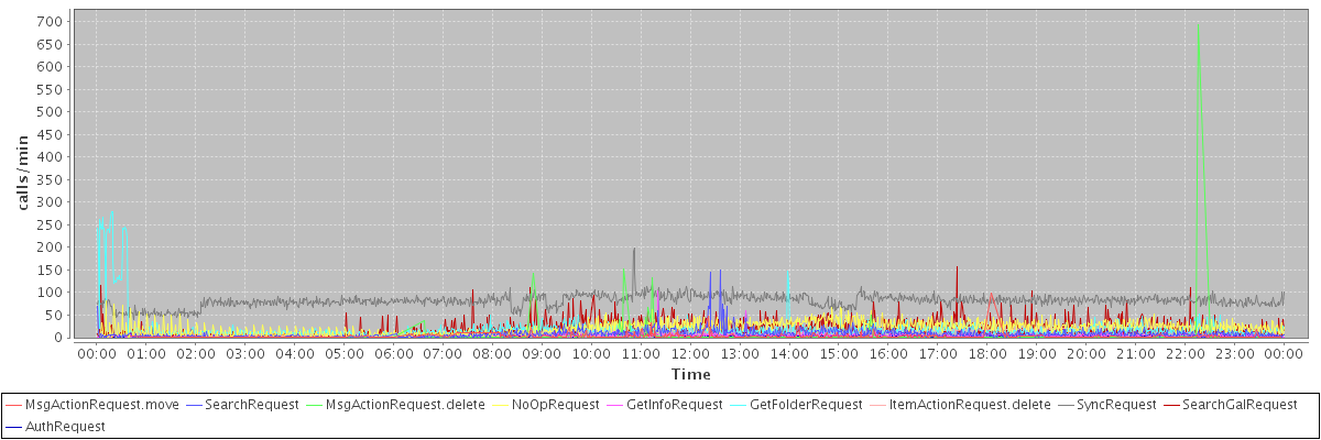 max(MsgActionRequest.move) = 99.00 max(SearchRequest) = 150.00 max(MsgActionRequest.delete) = 694.00 max(NoOpRequest) = 81.00 max(GetInfoRequest) = 103.00 max(GetFolderRequest) = 280.00 max(ItemActionRequest.delete) = 87.00 max(SyncRequest) = 199.00 max(SearchGalRequest) = 157.00 max(AuthRequest) = 101.00