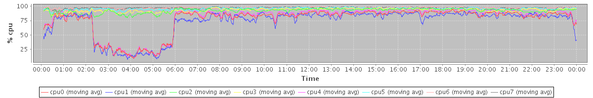avg(cpu0) = 7.94 avg(cpu1) = 7.41 avg(cpu2) = 5.28 avg(cpu3) = 4.97 avg(cpu4) = 4.93 avg(cpu5) = 3.18 avg(cpu6) = 2.30 avg(cpu7) = 2.25