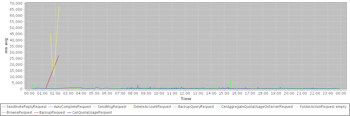 avg(SendInviteReplyRequest) = 249.00 avg(AutoCompleteRequest) = 236.83 avg(SendMsgRequest) = 506.58 avg(DeleteAccountRequest) = 37261.25 avg(BackupQueryRequest) = 299.00 avg(GetAggregateQuotaUsageOnServerRequest) = 2886.00 avg(FolderActionRequest.empty) = 518.40 avg(BrowseRequest) = 516.00 avg(BackupRequest) = 13897.50 avg(GetQuotaUsageRequest) = 4169.00