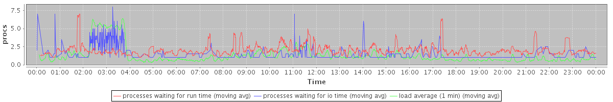 avg(processes waiting for run time) = 1.42 avg(processes waiting for io time) = 0.41 avg(load average (1 min)) = 1.28