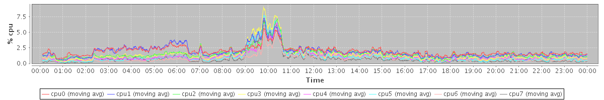 avg(cpu0) = 0.25 avg(cpu1) = 0.30 avg(cpu2) = 0.16 avg(cpu3) = 0.17 avg(cpu4) = 0.10 avg(cpu5) = 0.11 avg(cpu6) = 0.06 avg(cpu7) = 0.09