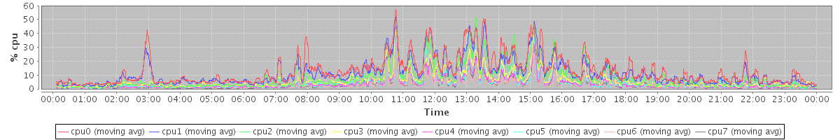 avg(cpu0) = 13.20 avg(cpu1) = 11.28 avg(cpu2) = 8.35 avg(cpu3) = 5.95 avg(cpu4) = 4.19 avg(cpu5) = 4.40 avg(cpu6) = 2.93 avg(cpu7) = 3.52