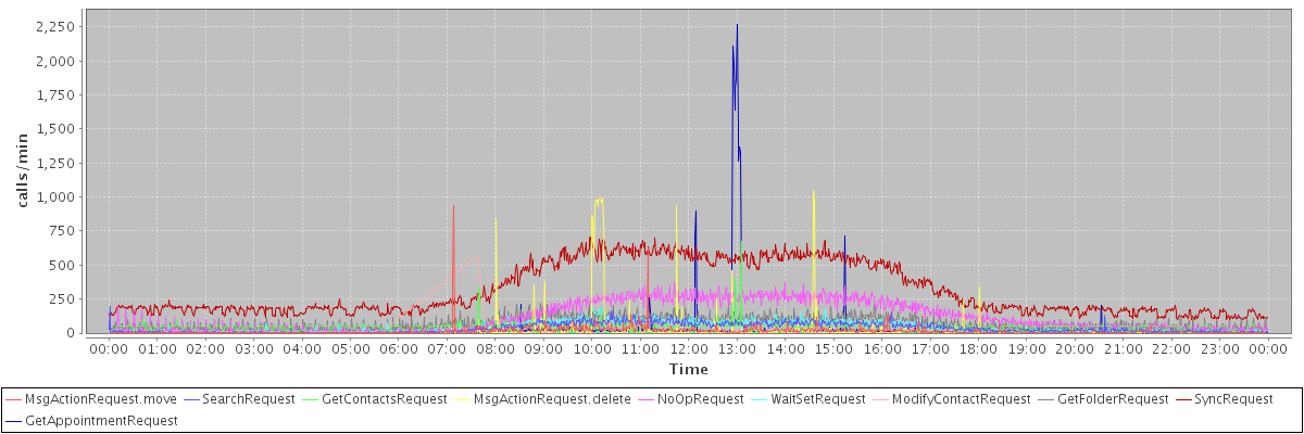 max(MsgActionRequest.move) = 938.00 max(SearchRequest) = 196.00 max(GetContactsRequest) = 674.00 max(MsgActionRequest.delete) = 1047.00 max(NoOpRequest) = 370.00 max(WaitSetRequest) = 195.00 max(ModifyContactRequest) = 570.00 max(GetFolderRequest) = 223.00 max(SyncRequest) = 709.00 max(GetAppointmentRequest) = 2271.00