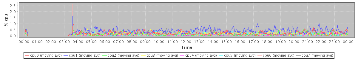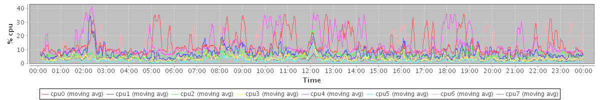 avg(cpu0) = 0.19 avg(cpu1) = 0.36 avg(cpu2) = 0.12 avg(cpu3) = 0.15 avg(cpu4) = 0.07 avg(cpu5) = 0.10 avg(cpu6) = 0.07 avg(cpu7) = 0.11