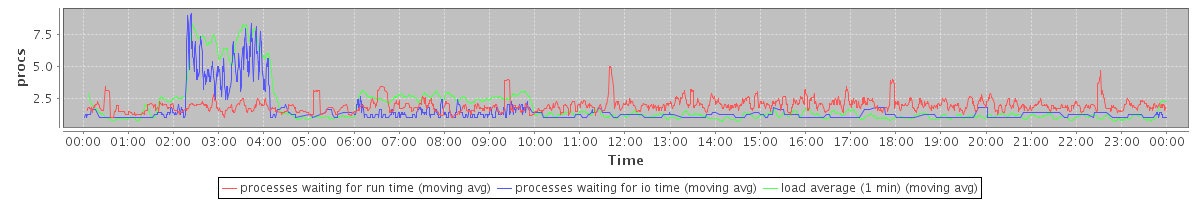 avg(processes waiting for run time) = 1.26 avg(processes waiting for io time) = 0.76 avg(load average (1 min)) = 1.84